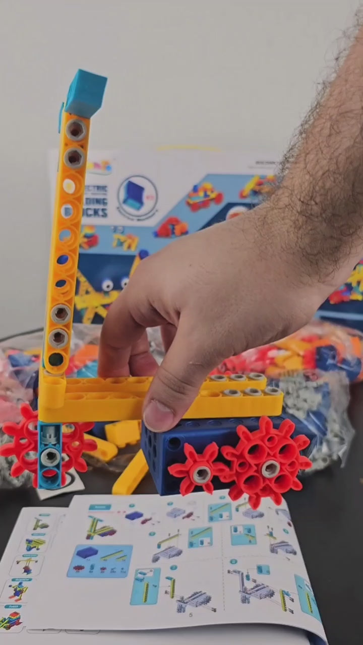 O brinquedo acompanha um manual ilustrado com vários modelos para montar, facilitando o aprendizado passo a passo e ajudando a criança a compreender conceitos básicos de engenharia, mecânica e funcionamento de engrenagens.